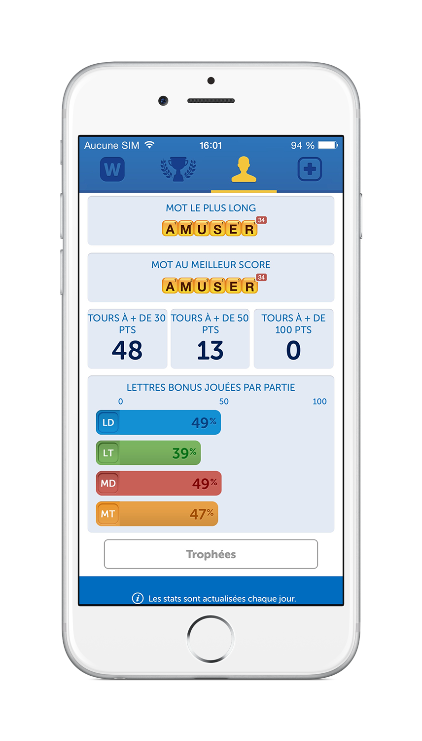 ll est temps de ressortir votre dictionnaire ! Le Scrabble est de retour ! mais cette fois-ci dans une toute nouvelle version. Une version qui a déjà conquis les américains et particulièrement la planète people, Words With Friends. Déjà sur le marché français depuis quelques mois mais dans sa version anglo-saxonne, Words with Friends est désormais disponible en français sur l’Apple store et sur Google Play et également en allemand. Les règles sont les mêmes que pour le Scrabble, deux joueurs s’affrontent, ils doivent former des mots avec des lettres qui ont chacune une certaine valeur, le nombre de points est additionné, l’idée est de faire le maximum de points ! Vous allez pouvoir challenger votre grand-mère mais surtout tous vos amis.